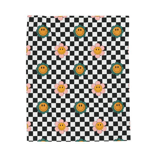 Velveteen Plush Blanket with Retro Checkerboard and Smiley Flowers Design, Funky Cool Home Decor, Teen Dorm Room, Colorful Throw Blanket